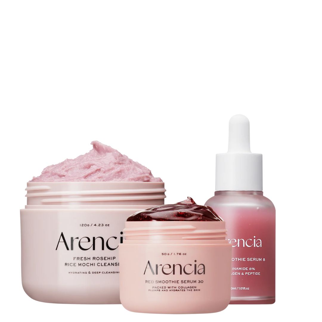 Begin with the Fresh Rosehip Rice Mochi Cleanser, a soft, elastic rice-based cleanser that gently removes impurities while maintaining moisture balance. Follow with the Red Smoothie Serum 8, a lightweight collagen-boosting serum that helps smooth skin texture and prep the complexion. Layer or alternate with the Red Smoothie Serum 30, a more intensive firming serum formulated to support elasticity and enhance a plump, pore-refined appearance. Used together, these steps help skin look smoother, firmer, and more refined over time.