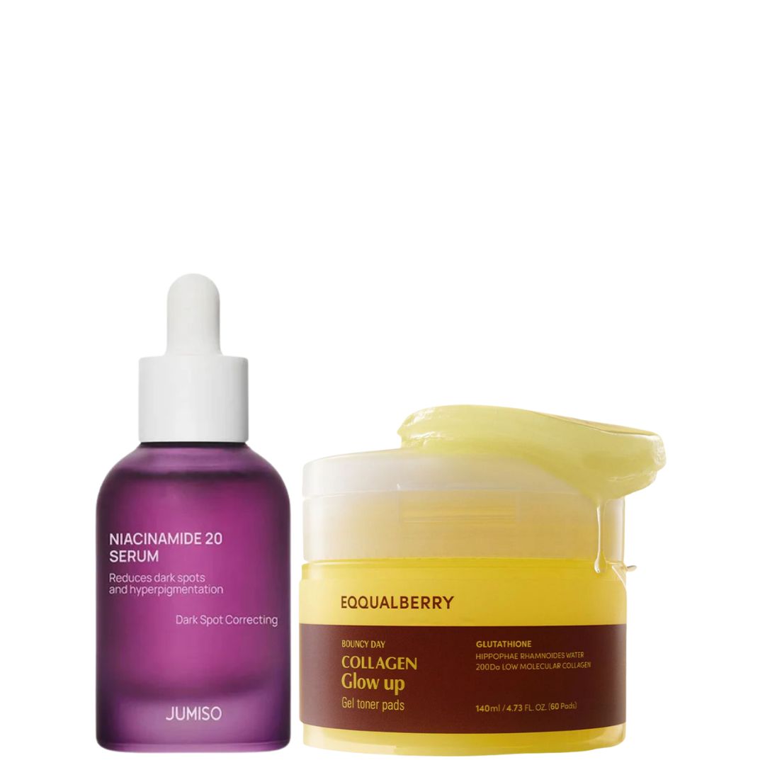 The Jumiso Niacinamide 20 Serum targets stubborn pigmentation and dullness to help improve clarity and even tone. The Eqqualberry Collagen Glow Up Gel Toner Pads gently prep and hydrate the skin, supporting smoother texture and better absorption for brighter-looking results with daily use.