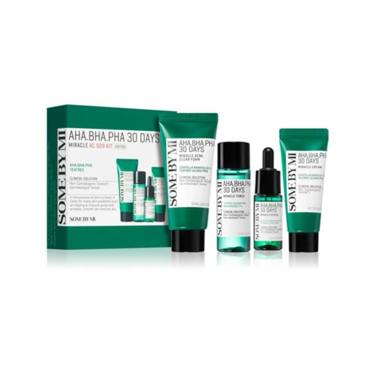 The Some By Mi AHA·BHA·PHA 30 Days Miracle AC SOS Kit is a complete 4-step acne care routine formulated to exfoliate, soothe, and purify troubled skin. Developed with AHA, BHA, and PHA, the set gently removes dead skin cells and unclogs pores while Tea Tree Extract (10,000ppm) and Centella Asiatica calm irritation and control sebum.