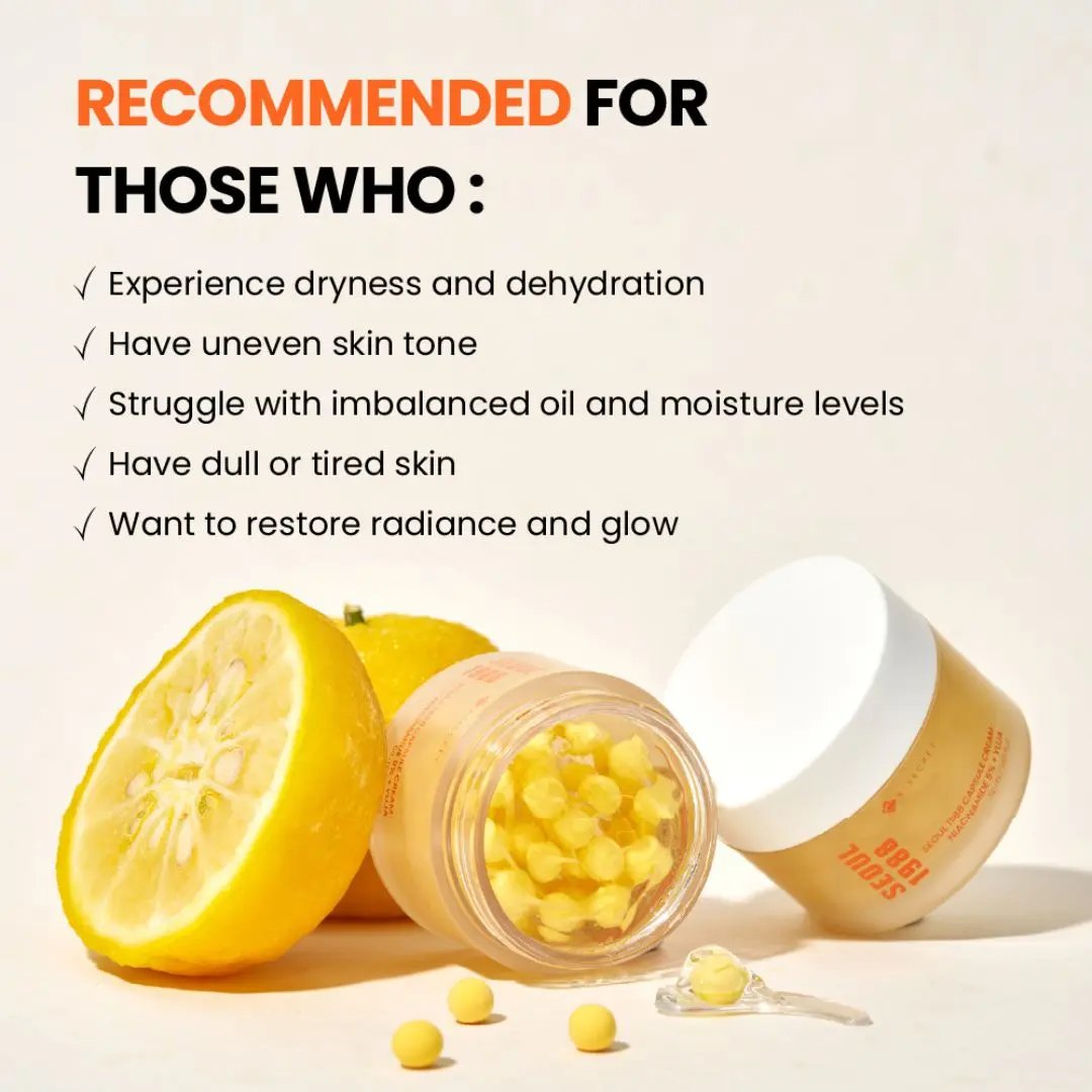 The Seoul 1988 Capsule Cream: Niacinamide 5% + Yuja is a nourishing daily cream designed to brighten, hydrate, and revitalize dull or uneven skin. Featuring Niacinamide (5%), it helps fade dark spots, minimize pores, and improve skin clarity, while supporting a stronger skin barrier.